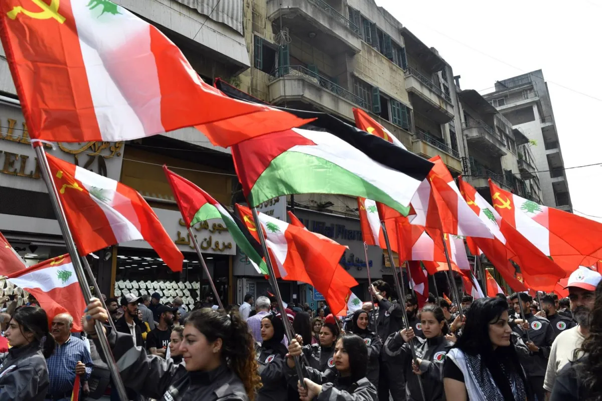 Lübnanlı partiler ve vatandaşlar, Beyrut'ta düzenlenen İşçi Bayramı yürüyüşünde Filistin ve Lübnan bayrakları açtı. (EPA)