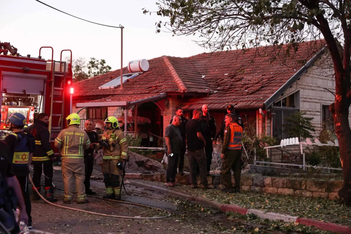 İsrail güvenlik güçleri ve itfaiyeciler, Lübnan'da Hizbullah'ın attığı füzeyle hasar gören bir evin yakınında (AFP)