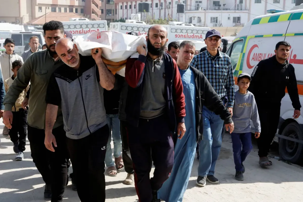 Filistinliler, İsrail'in Gazze Şeridi'nin güneyindeki Han Yunus'taki saldırılarında öldürülen kurbanlardan birinin naaşını taşıyor (Reuters)