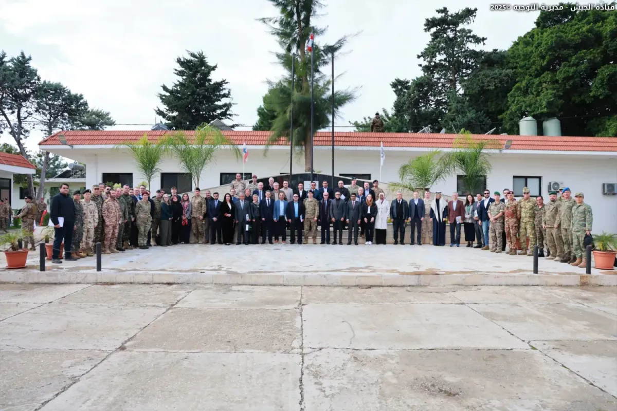 Lübnan Genelkurmay Başkanı General Rudolf Heykel, 15 Aralık 2025 tarihinde Lübnan'ın güneyindeki Tire şehrinde bulunan Güney Litani Komutanlığı'nda, ordunun Güney Litani bölgesindeki planının ilk aşamasının uygulanmasını incelemek üzere düzenlenen saha gezisi sırasında büyükelçiler, maslahatgüzarlar ve askeri ataşeler arasında duruyor (Lübnan ordusunun X sayfası)