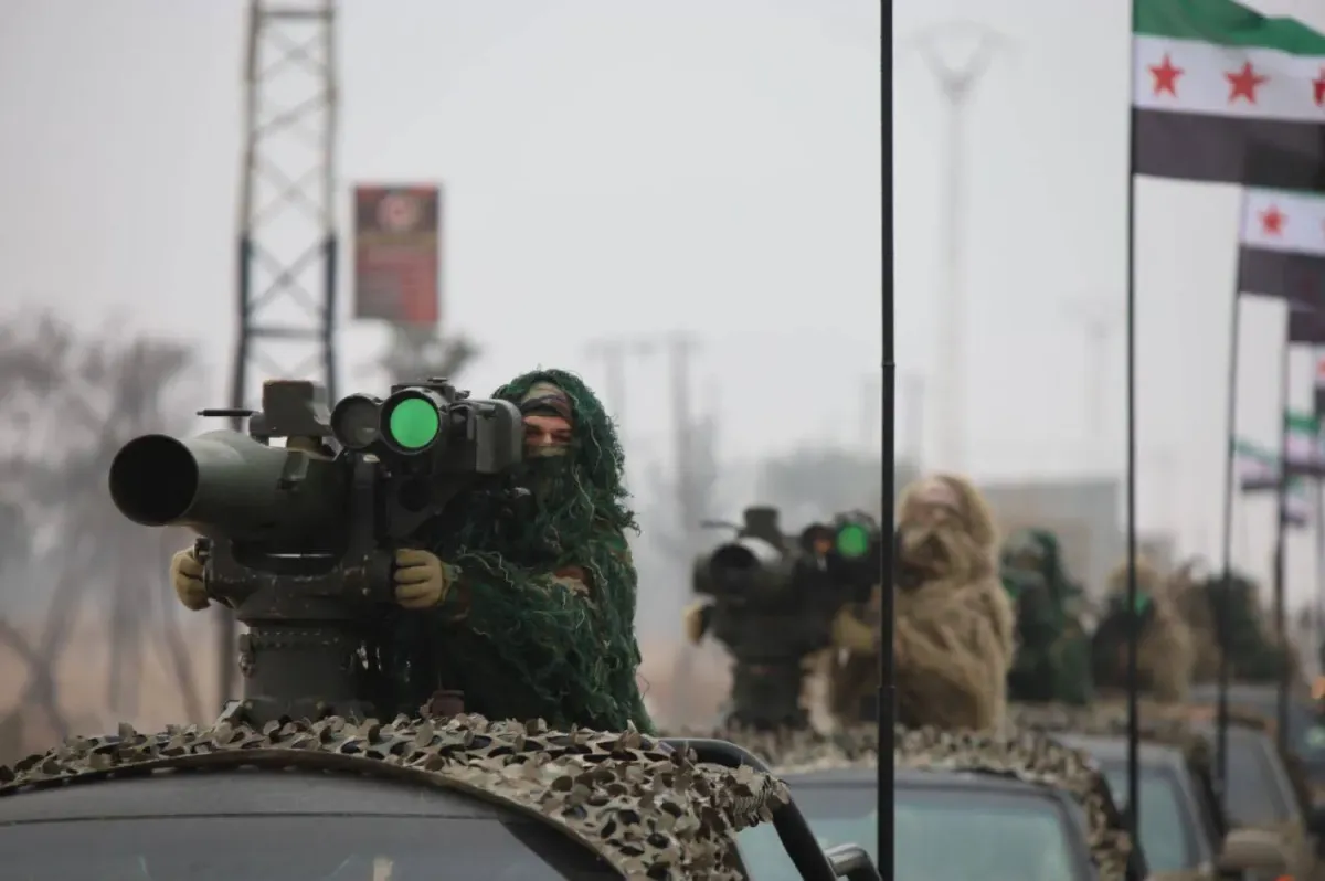 Suriye Devlet Başkanı Beşşar Esed'ın devrilmesinin birinci yıldönümünde Halep'te düzenlenen askeri geçit töreninde, tanksavar füzeleri taşıyan Suriye askerleri (Suriye Savunma Bakanlığı)