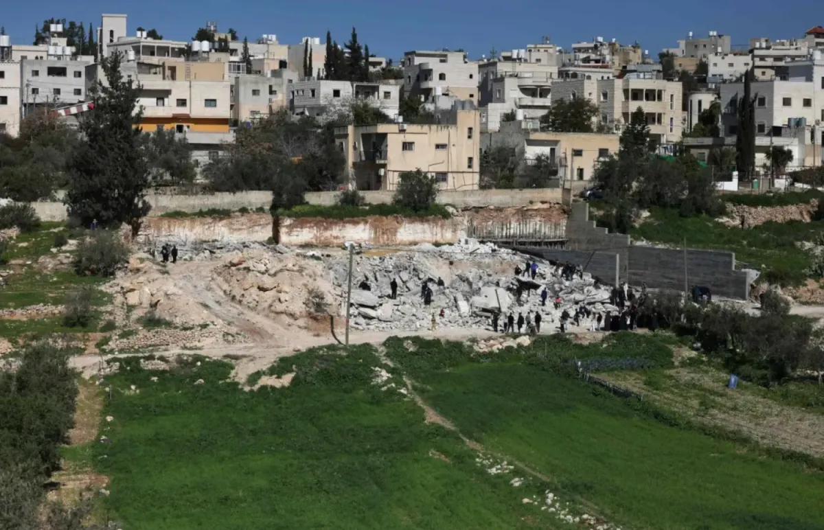 İşgal altındaki Batı Şeria’nın El Halil kentinin batısında, Filistinlilere ait evler ve dükkanlar İsrail buldozerleri tarafından enkaz yığınlarına dönüştürüldü. (AFP)