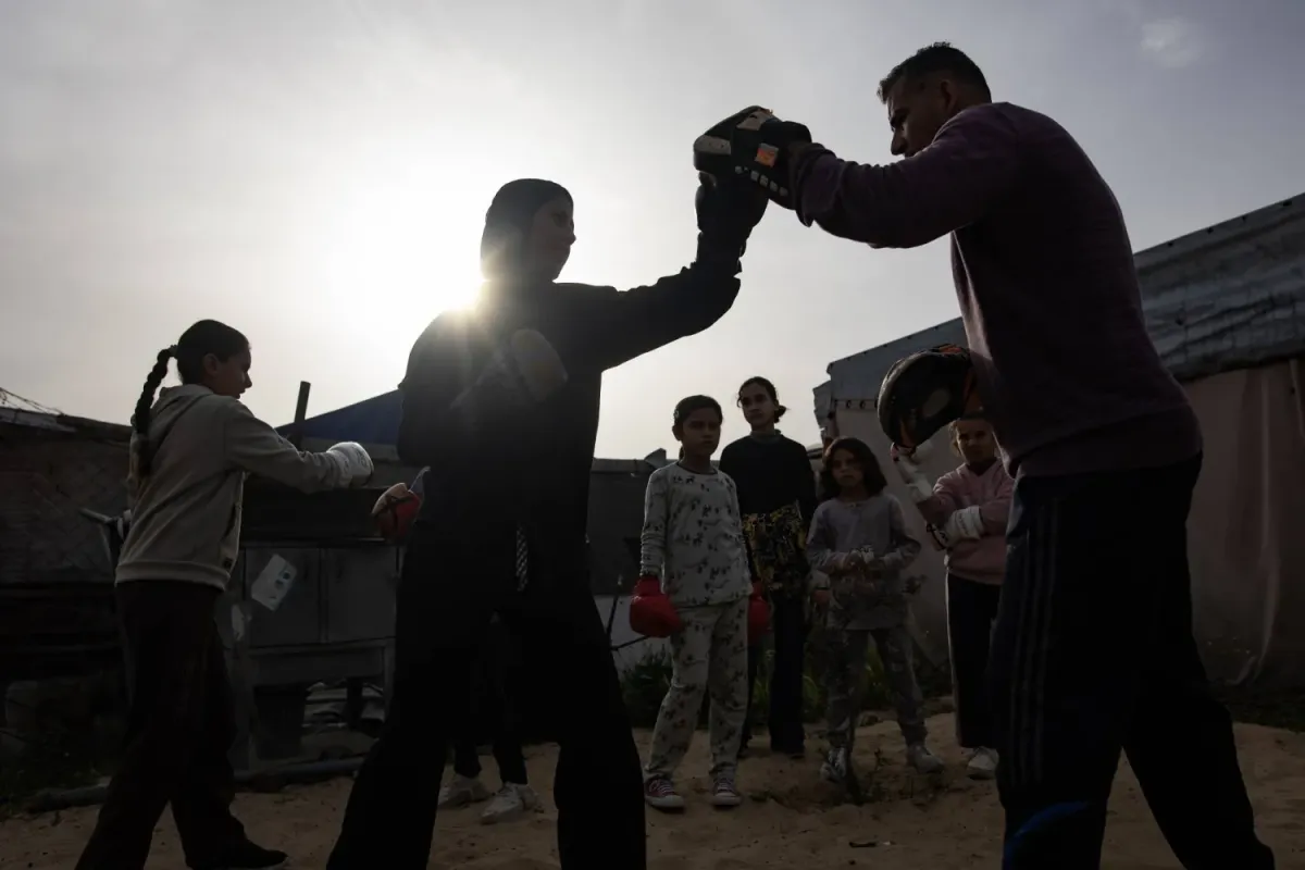 Gazze Şeridi’nin güneyindeki yerinden edilmiş sivillerin çadırları arasında, kum zemine kurulan derme çatma bir boks ringinde kız çocukları ısınma hareketleri yapıyor. Ardından antrenörlerinin talimatları eşliğinde güçlü yumruklar savuruyorlar. Antrenörleri, bunun iki yıldır süren şiddetli savaşın ardından yaşadıkları travmayı hafifletmeye yardımcı olduğunu söylüyor.