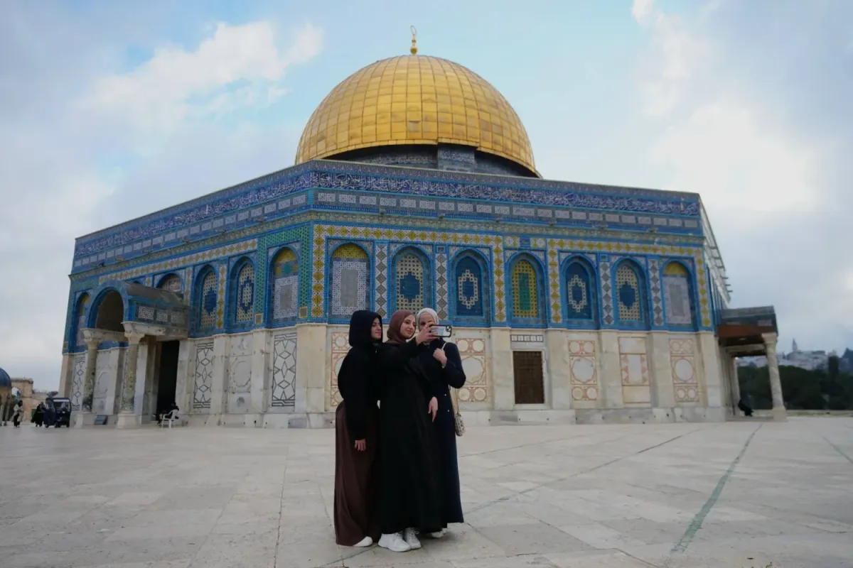 Kudüs’teki Kubbetu’s Sahra’nın önünde fotoğraf çekilen Filistinli kadınlar, 9 Nisan 2026 (AP)