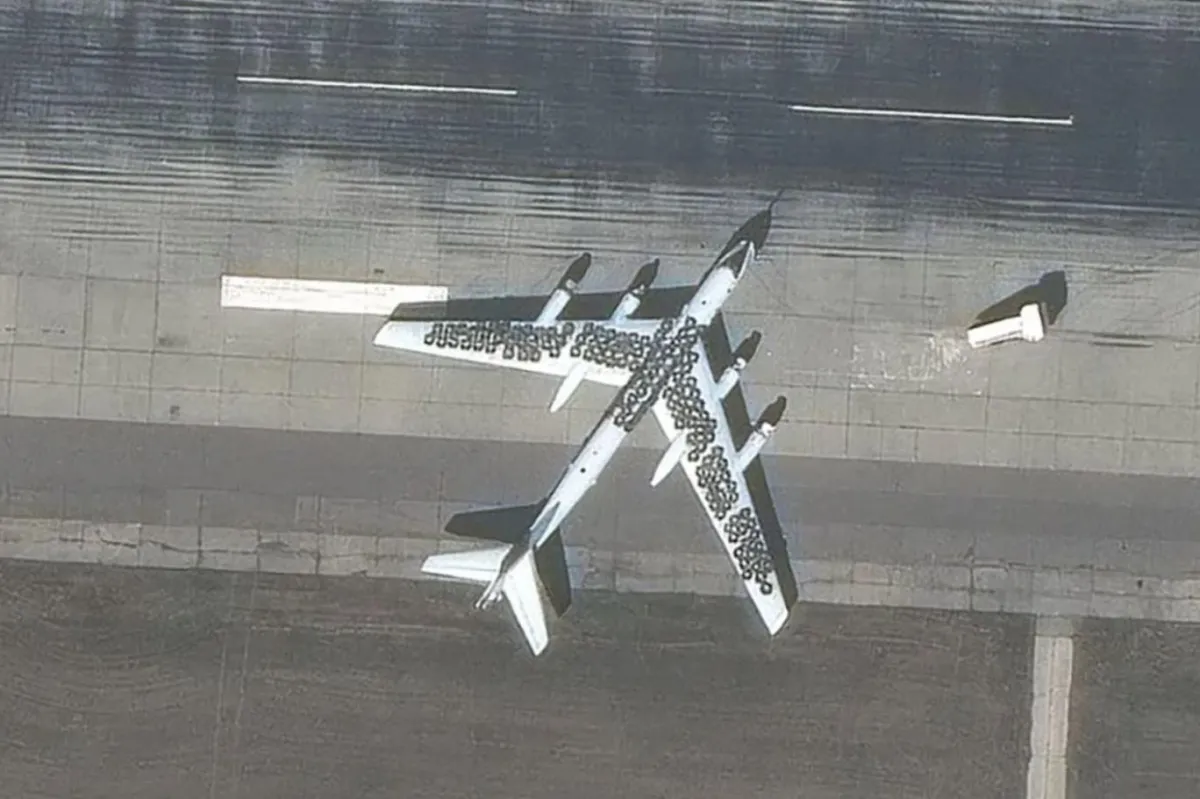 Maxar'ın üsten edindiği uydu görüntülerinde, iki Tu-95 tipi bombardıman uçağının kanatlarına ve gövdesinin bir kısmına onlarca araba lastiği yerleştirildiği görülüyor.