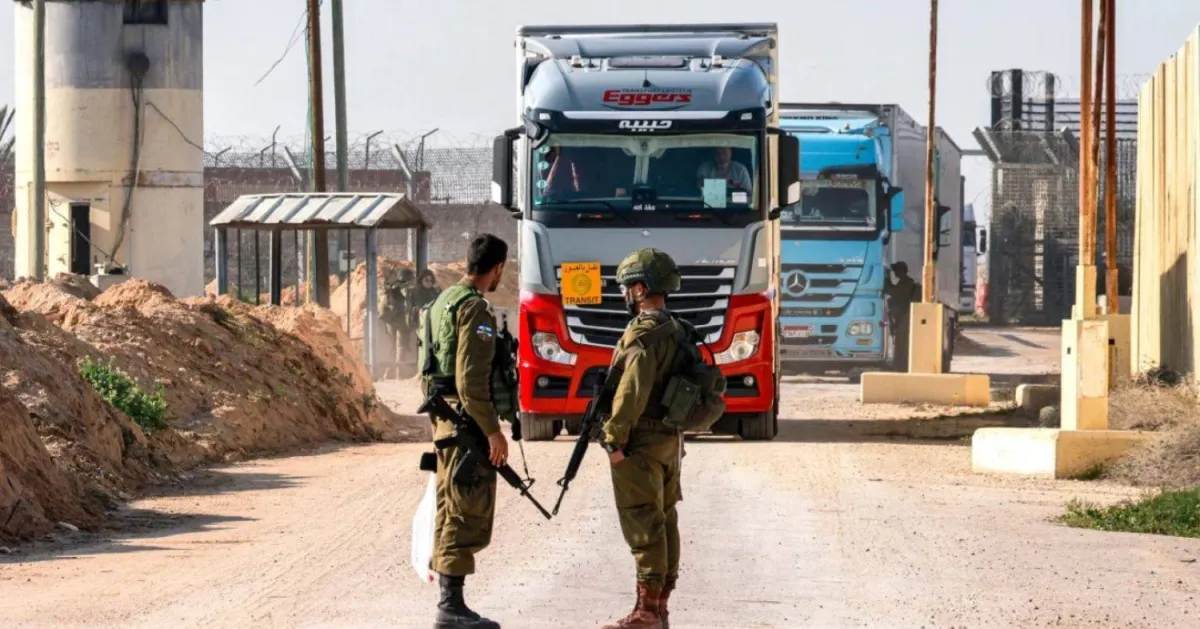 Salı günü, güney Gazze Şeridi ile Kerem Şalom sınır kapısının İsrail tarafında insani yardım yüklü kamyonlar hareket ederken İsrail askerleri nöbet tutuyor (AFP)