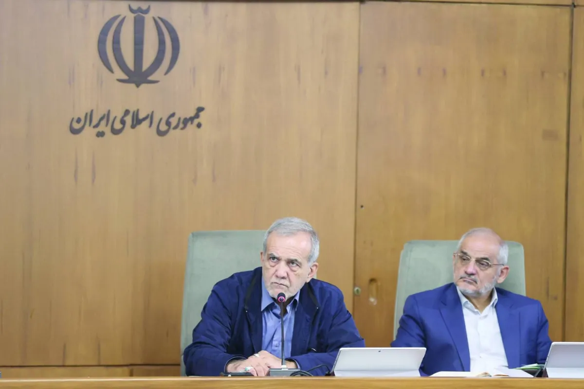 Pezeşkiyan ve özel kalemi Muhsin Hacı Mirzai geçen çarşamba günü yapılan hükümet toplantısında (İran Cumhurbaşkanlığı)