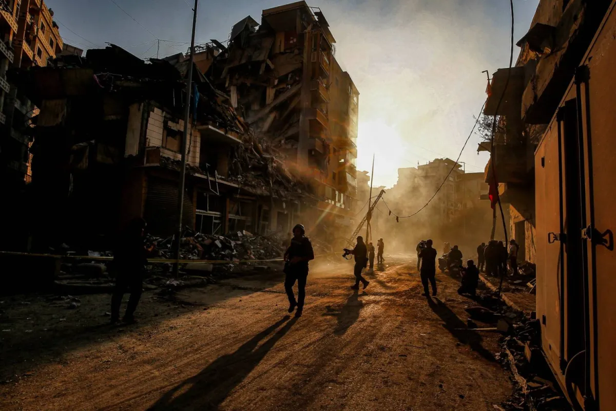 İsrail'in Beyrut'un güney banliyölerine düzenlediği saldırılarda yıkılan binaların arasında yürüyen gazeteciler (DPA)