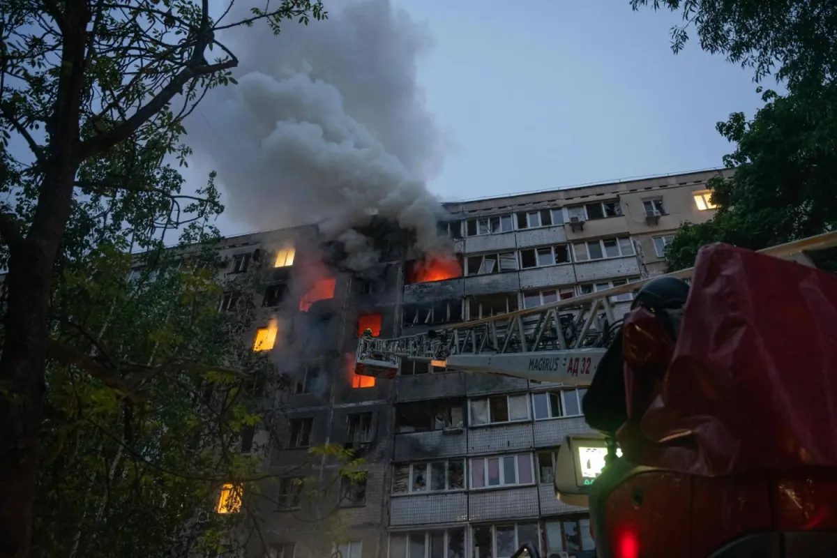 İtfaiye ekipleri, Ukrayna'nın başkenti Kiev'de bir konut binasında Rus drone saldırısı sonucu çıkan yangını söndürmek için çalışıyor (AFP)