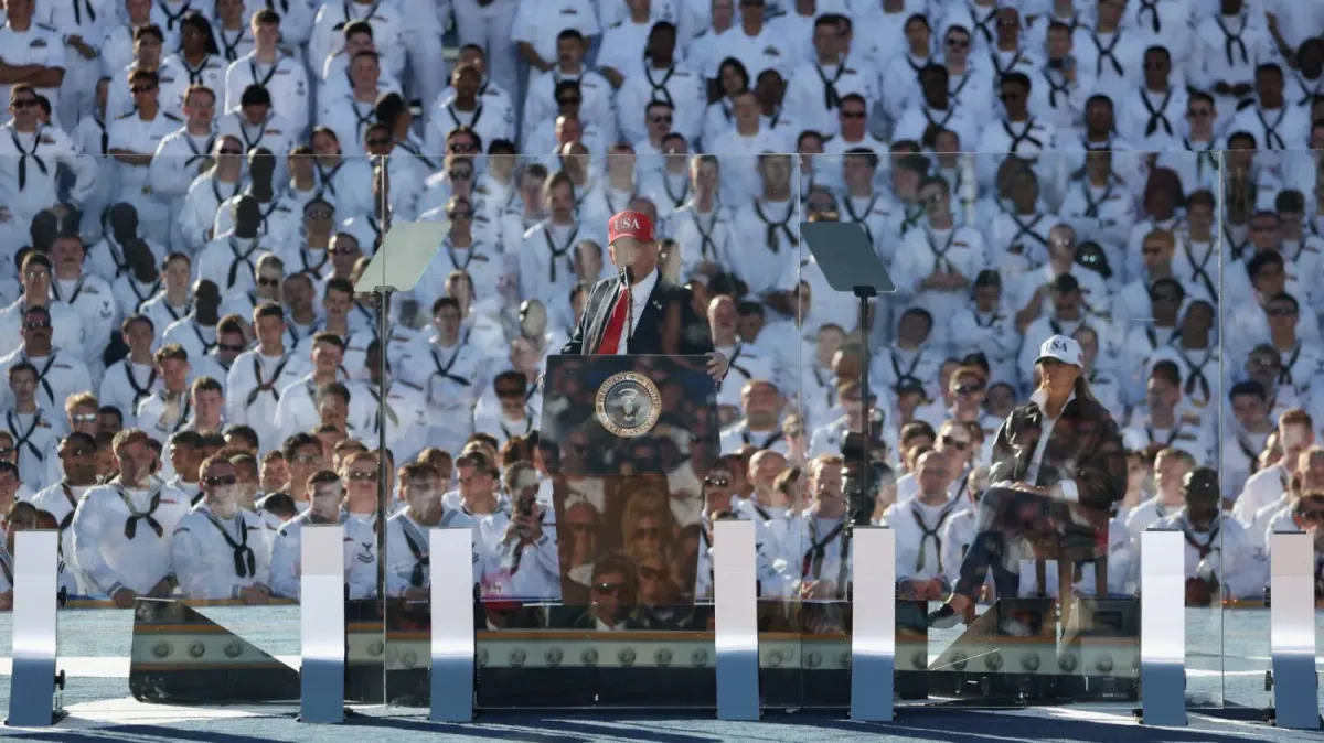 Trump, Norfolk Deniz Üssü'nde ABD uçak gemisi Harry S. Truman'ın yanında konuşma yaparken (Reuters)