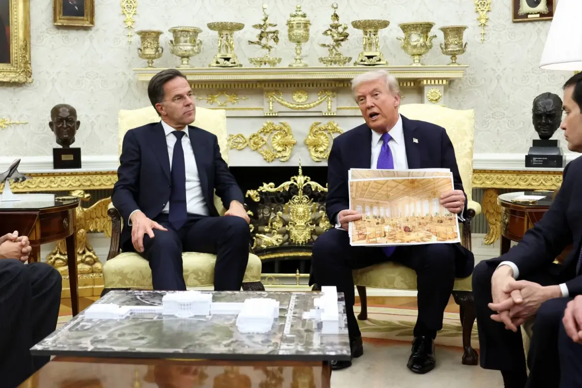 Trump, NATO Genel Sekreteri Mark Rutte’yi karşılarken yeni Beyaz Saray balo salonunun çizimini gösterdi (Reuters)