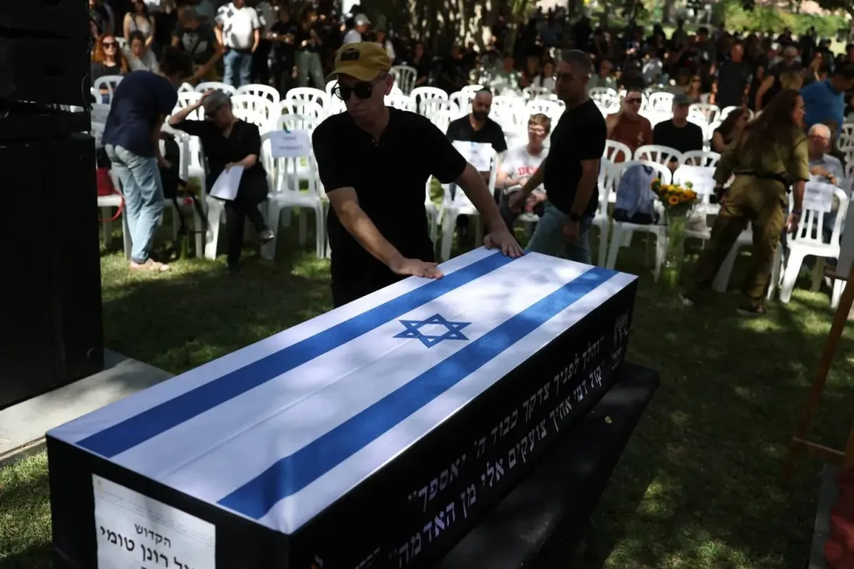 Rehine Ronen Engel'in cenaze törenine katılan İsrailliler, Güney İsrail'deki Gazze sınırına yakın Nir Oz Kibbutz'unda (EPA)
