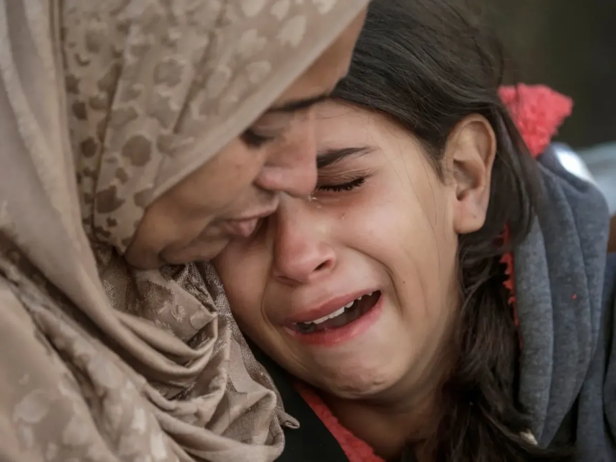 İki Filistinli kadın, İsrail'in Ams kentine düzenlediği hava saldırısında yakınlarını kaybetmelerinin acısını paylaşıyor (EPA).