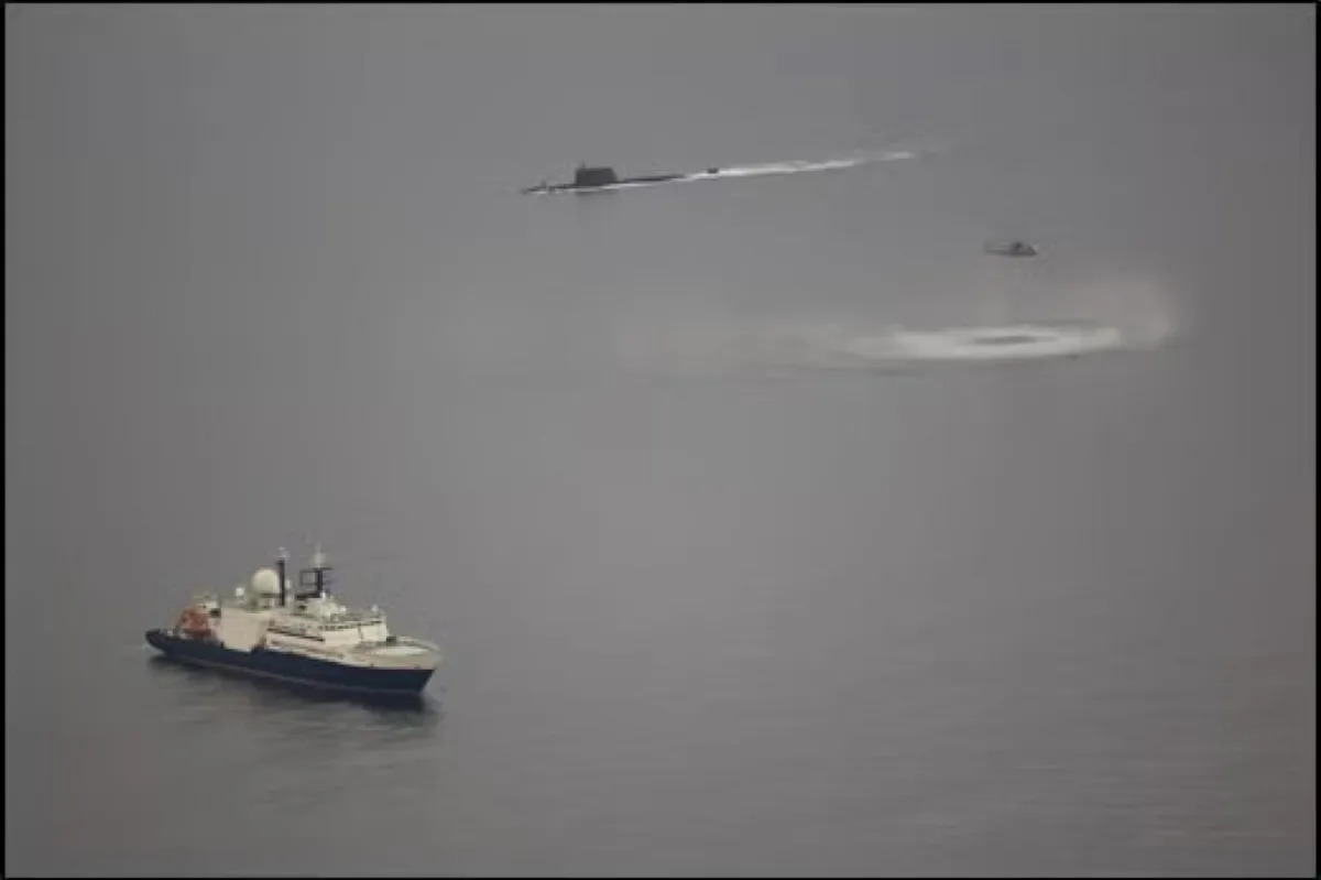 Geçen yıl kasımda İrlanda Denizi'nde Yantar'ı takip eden bir denizaltısavar Merlin Mk2 helikopteri ve yakınlarda yüzeye çıkmış bir Britanya denizaltısı da fotoğrafta görülebiliyor.