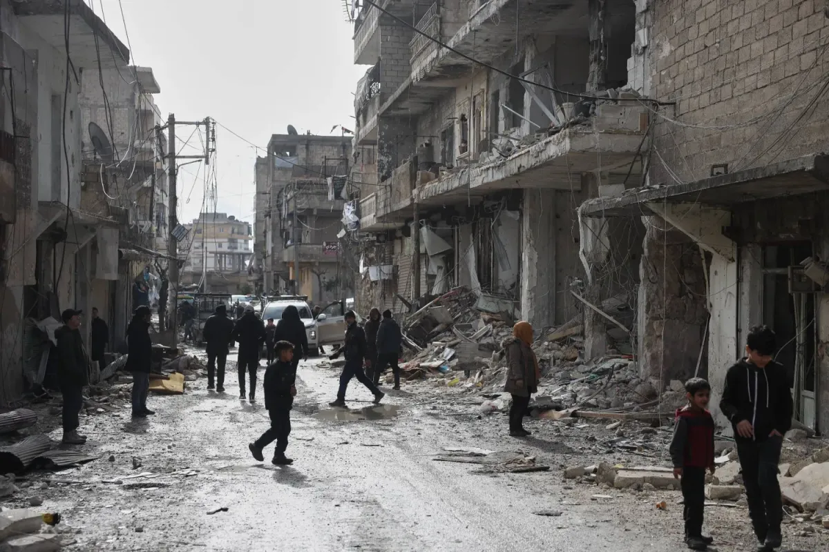 Suriye'de son çatışmaların ardından Halep'in Şeyh Maksud mahallesindeki binalarda meydana gelen hasarı inceleyen Suriyeliler (AP)
