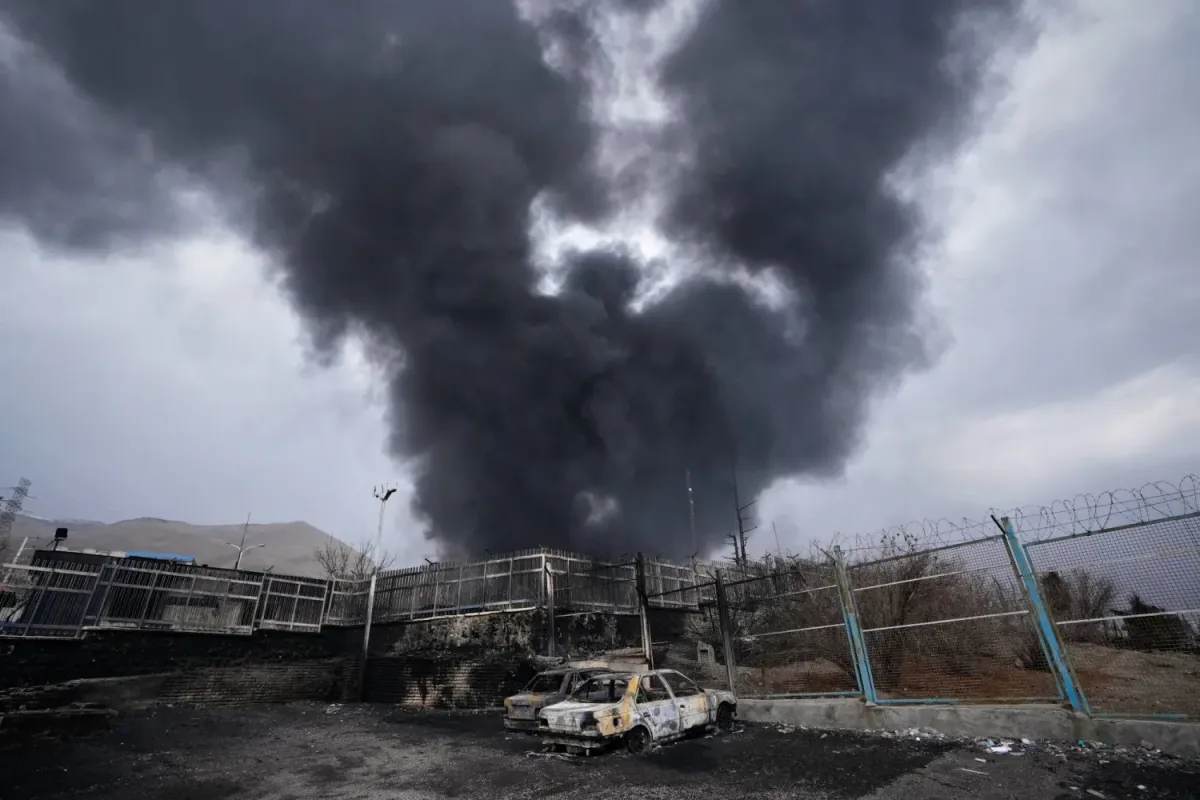 Tahran'da vurulan bir petrol depolama tesisinden yükselen yoğun bir duman sütunu (AP)