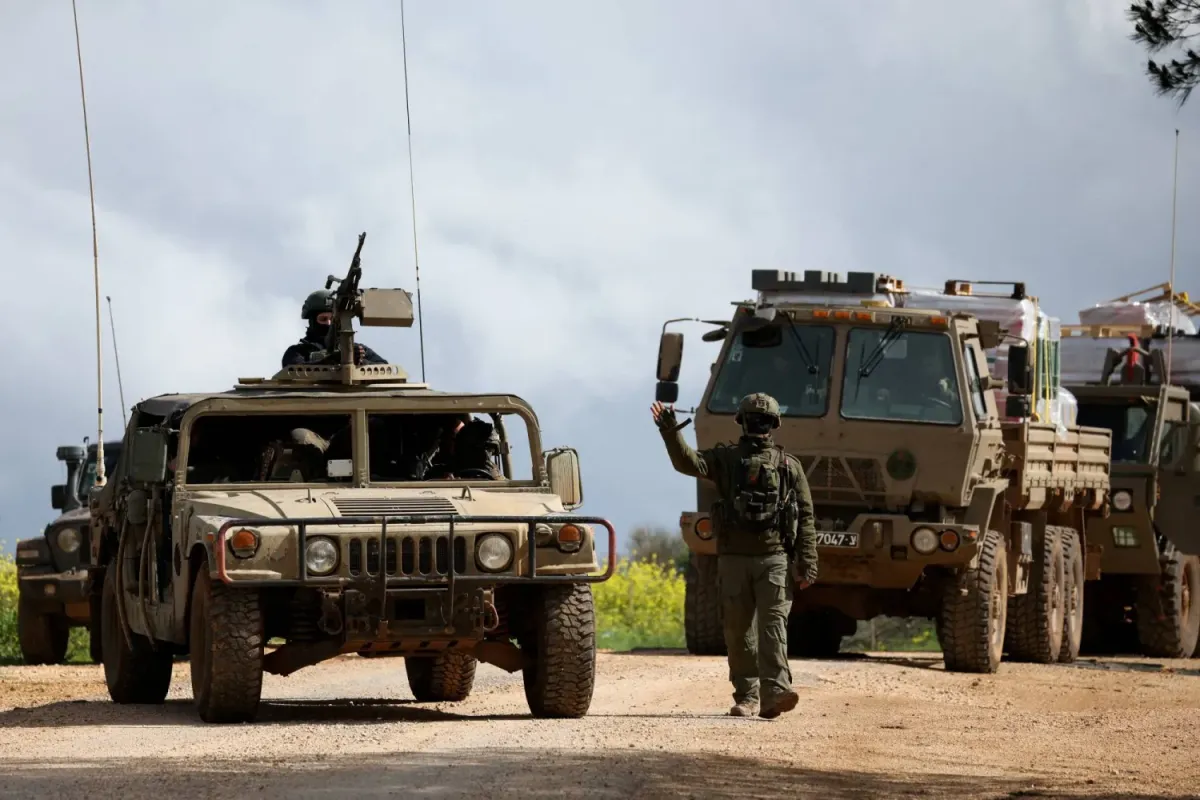 Lübnan sınırına yakın bir bölgede askeri araçların yanında yürürken eliyle işaret eden bir İsrail askeri... İsrail’in kuzeyi, 30 Mart 2026 (Reuters)