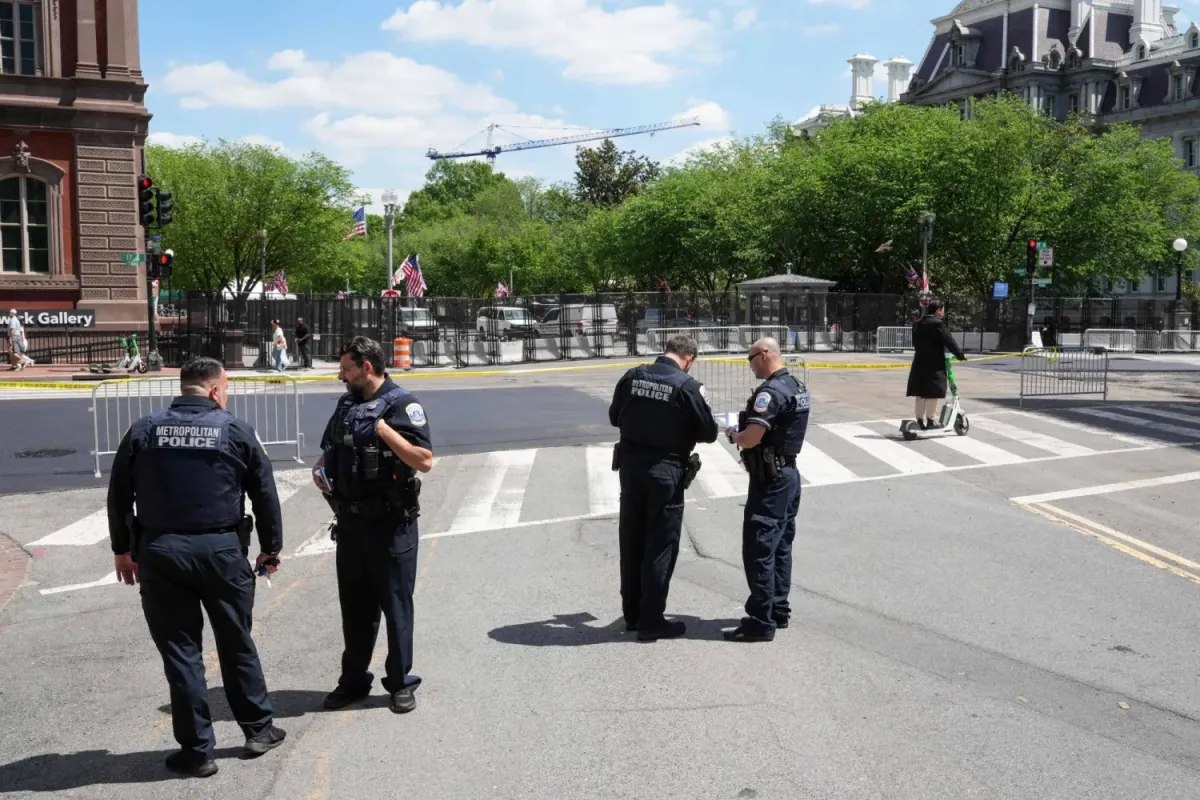 İngiltere Kralı III. Charles ve Kraliçe Camilla'nın ABD başkenti Washington'a gelişinden önce, Beyaz Saray yakınlarındaki kapalı yolda polis memurları, 27 Nisan 2026 (AFP)