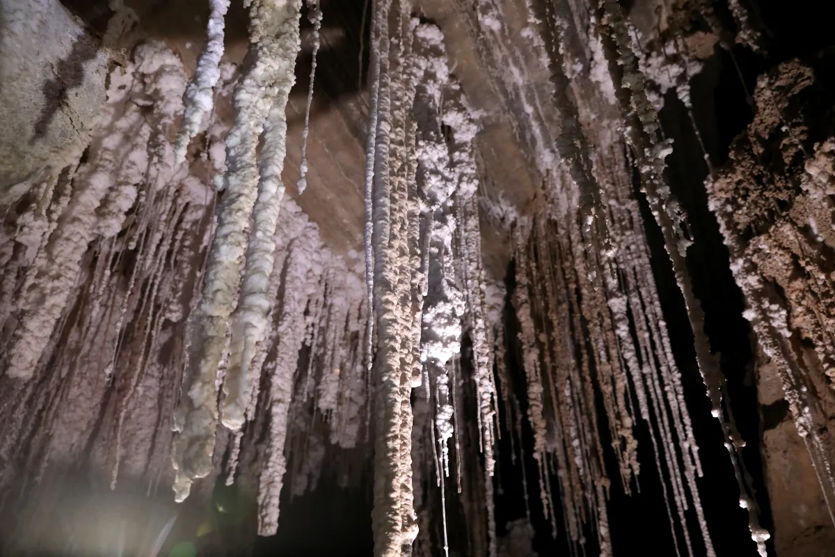 Mağarada tuz sarkıtları bulunuyor ve bazı duvarlar tuz kristalleriyle parlıyor: Bazı sarkıtların ucunda ise tuzlu su damlaları görülebiliyor.