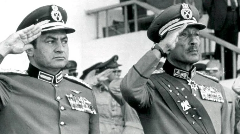 Mübarek’in 6 Ekim 1981'deki askeri geçit töreni sırasında Mısır’ın eski Devlet Başkanı Enver Sedat’ın suikasta uğramadan önce yanında görüldüğü bir fotoğraf (EPA)