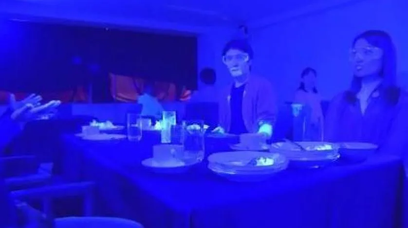 Daha sonra oda karartıldı ve parlayan floresan boyanın diğer katılımcıların ellerine ve yüzlerine, masalara ve araç gereçlere bulaştığı ortaya çıktı.