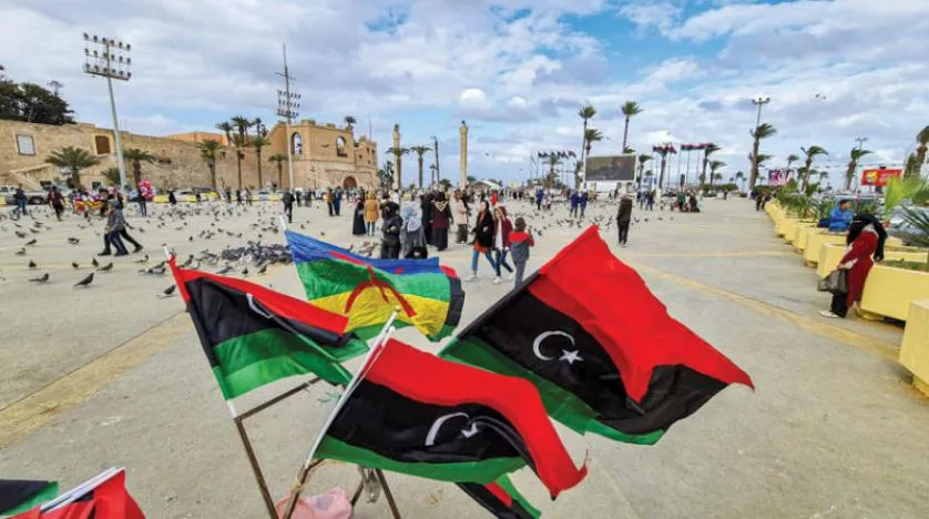Trablus’taki Şehitler Meydanı’nda devrimin yıldönümü kutlamalarına hazırlık olarak yükseltilen Libya ve Berberi (Amazig) bayrakları (AFP)