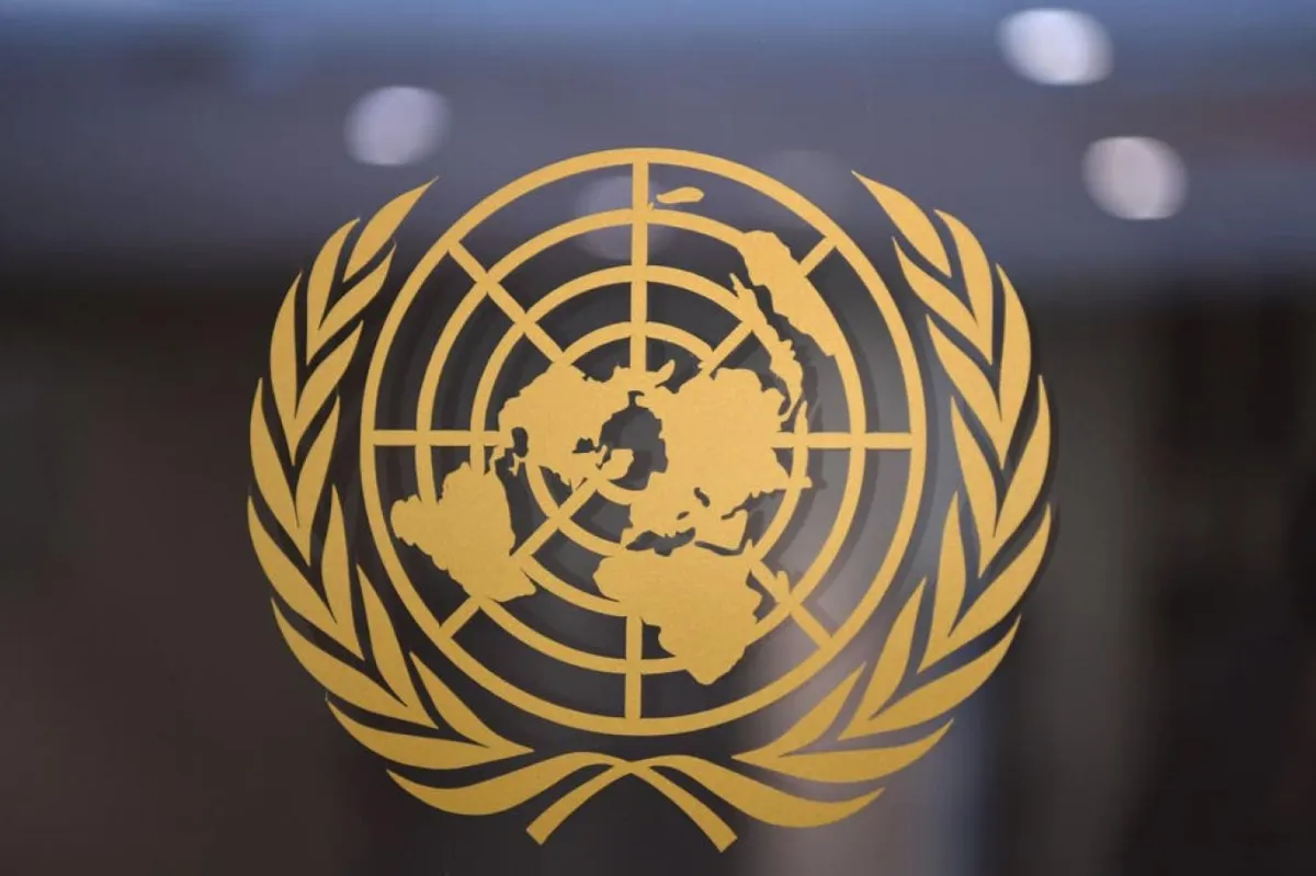 25 Şubat 2021'de New York'taki Birleşmiş Milletler Genel Merkezi'nin içinde görülen Birleşmiş Milletler logosu (AFP)