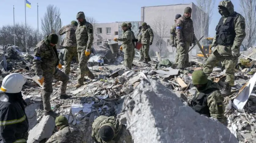 Ukraynalı askerler, dün Rusya tarafından Mykolaiv şehrinde bombalanan bir askeri kışlanın yıkılmasıyla cesetleri ararken (AFP)