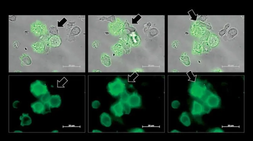 Oklar, kanser hücresinin bir kısmı çalındıktan sonra yeşile dönen doğal öldürücü hücreyi gösteriyor (Araştırma Ekibi)