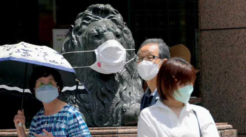 Tokyo'daki Ginza nakliye bölgesinde de mağazanın önde gelen duran maske takılı aslan heykeli (AP)