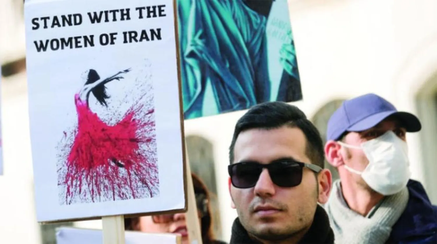 Venedik’te ‘İranlı kadınların yanında durun’ yazılı bir pankart tutan genç bir adam (Reuters)