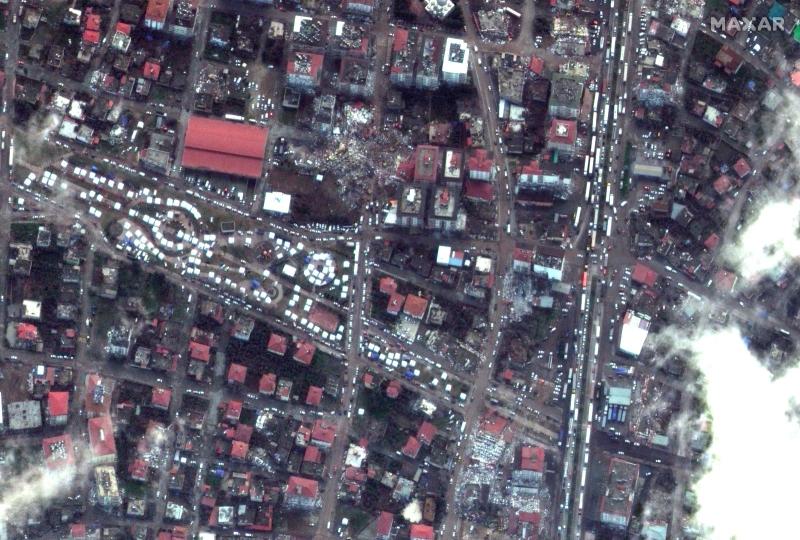 Depremden sonra İslahiye ilçe merkezindeki yıkılan binalar ve kurtarma çalışmaları (Uydu görüntüsü ©2023 Maxar Technologies)