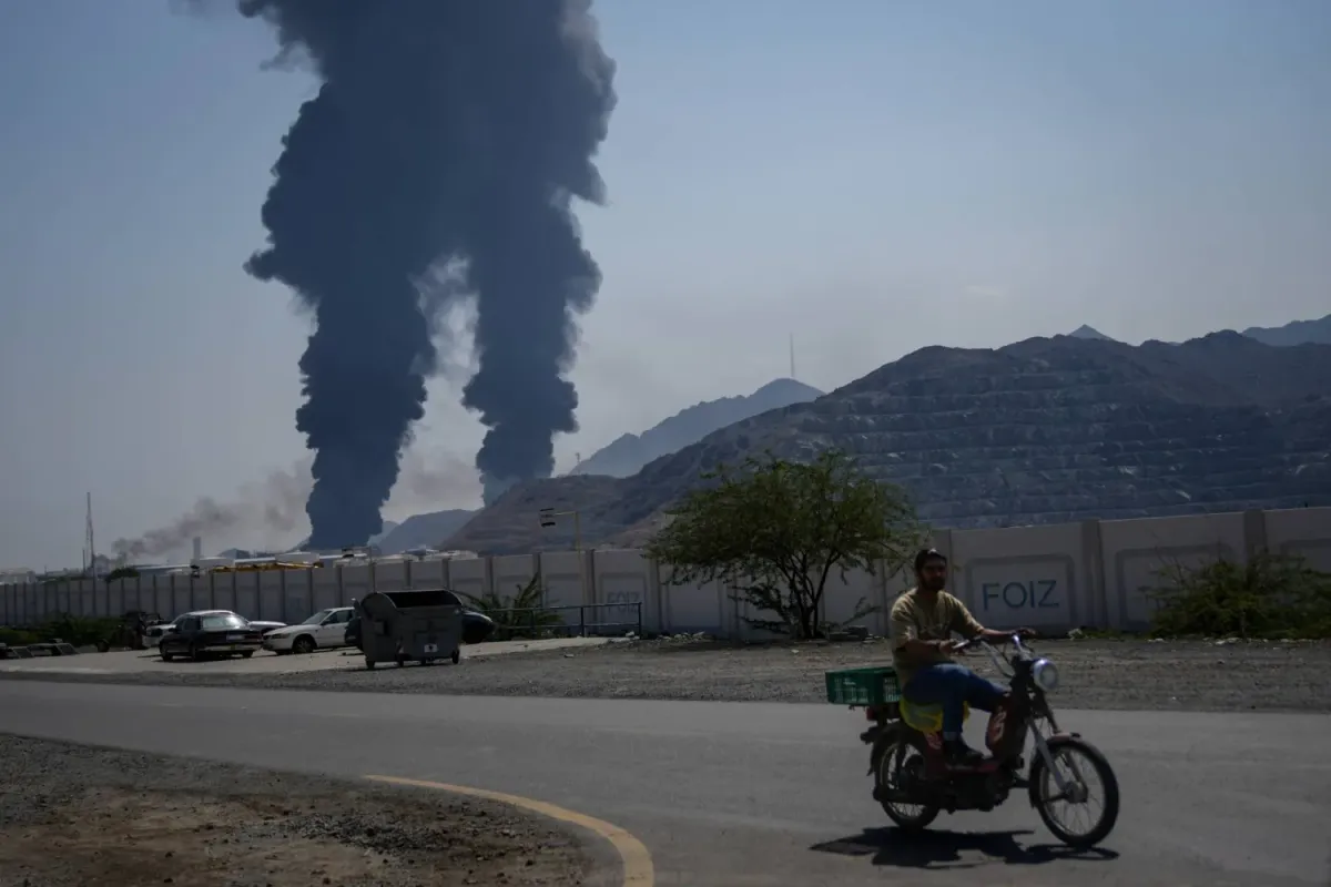 Fuceyre'deki yetkililere göre 14 Mart'ta İran'a ait İHA enkazının bir petrol tesisine isabet etmesinin ardından yükselen alevler ve duman bulutları arasında bir adam bisiklet sürüyor (AP)