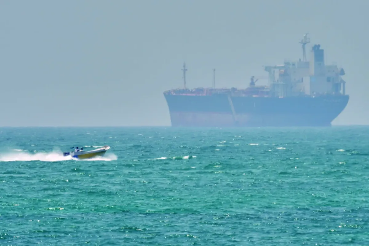 Hürmüz Boğazı’nda bir yük gemisinin yanından geçen sürat teknesi (AP)